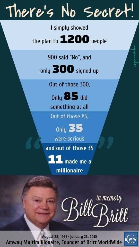 And Bill Britt answered it like There is no secret, I simply showed the plan to 1200 people. 900 said NO and only 300 signed up. Out of those 300 only 85 did anything at all. Out of those 85 only 35 were serious and out of those 35, 11 made me a multi-millionaire .